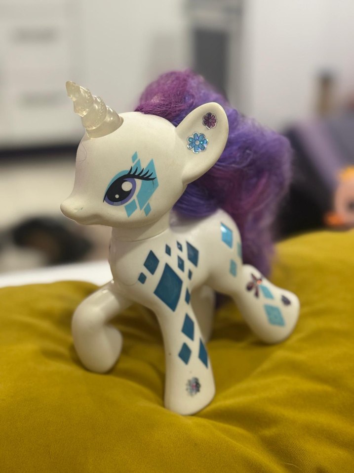 Bu beyaz unicorn figür, pastel renkler ve mavi desenlerle süslenmiş, mor yeleye sahiptir. Pilli temiz çalışır durumda orjinal ürünür büyük boy