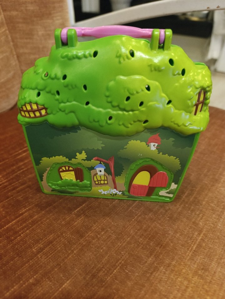 Pembe saplı, renkli yeşil oyuncak ev şeklinde çanta, pencere ve kapı tasarımlarıyla süslenmiştir.