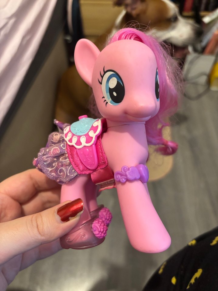 Pastel pembe renkte, büyük gözlü, örgülü yeleli ve süslü aksesuarları olan at figürü. 13 yıllık, orijinal mlp oyuncağı
