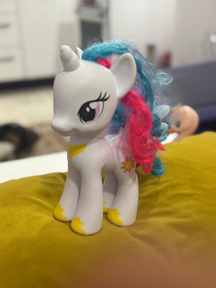 Pastel beyaz unicorn figürü, mavi ve pembe saçları, büyük gözleri ve sarı desenleriyle dikkat çekiyor. Orjinal ürün tertemiz az kullanıldı 3 fotodaki aksesurlardaki sarı taç ürüne dahildir