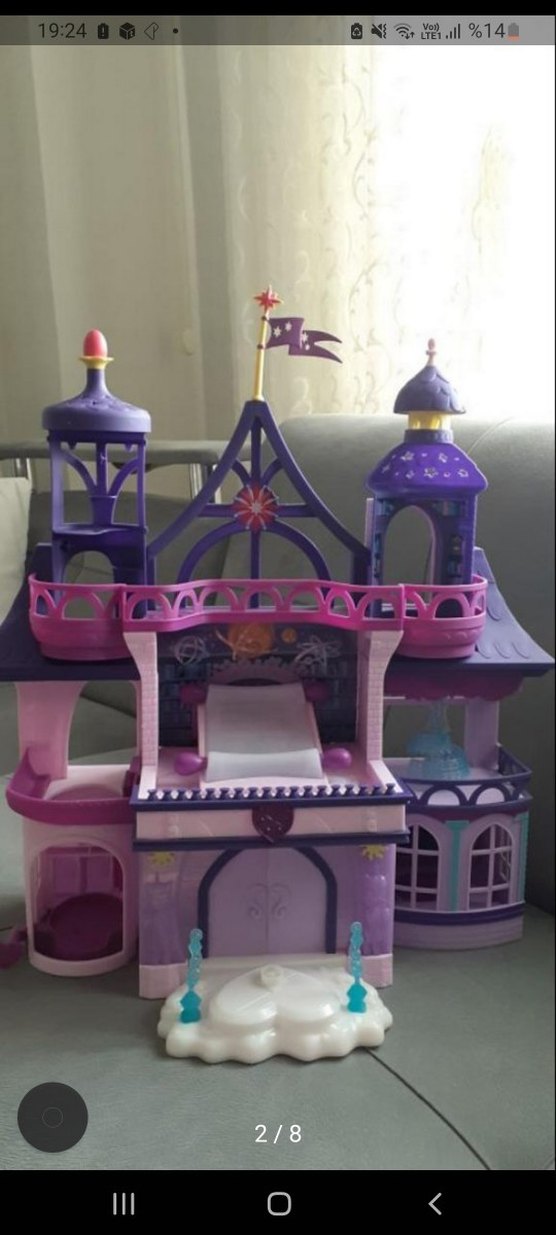 My Little Pony Twilight Sparkle'ın Arkadaşlık Okulu. ORJINALDIR.orjinal kutusunda. Pil ışık hersey çalışır durumda. Oyuncakların bir kısmı yok. Elimdeki pony oyuncakları bulup vericem. Evinizdeki ponylerlede oyun kurulabilir. #pony #ponyevi #masalevi #mylittepony #twilight #sparkle #oyuncak #oyuncakev Koyu mor renkte, çoklu kuleleri, balkonları ve süslemeleri olan oyuncak kale. Hayal gücünü destekler.