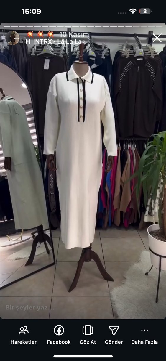 Uzun beyaz elbise, uzun kollu ve yakalıdır. Düğmeli detaylara sahip, düzenli kesim ve minimalist sokak stili sunar, sentetik kumaştan üretilmiştir.