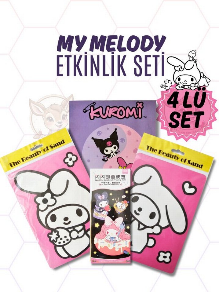 My Melody karakterli, pastel pembe renklerde 4'lü etkinlik seti. 2 adet melody Kum boyama, 1 adet 12 sqyfa kazıma defteri, 1 adet maskeli Sanrio boyama kitabı