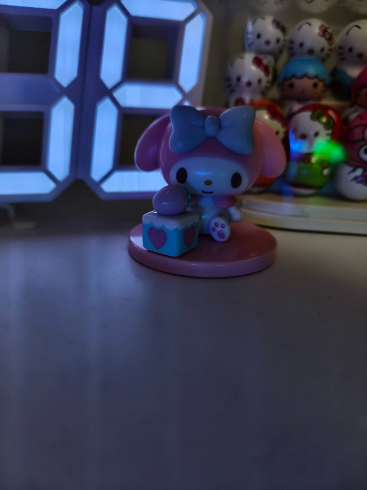Pastel pembe renkte, büyük mavi fiyonk detaylı My Melody figürü, yuvarlak taban üzerinde küçük kalpli küp tutuyor. gorundugu gibi