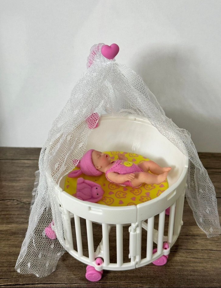 Pastel pembe kıyafetli bebek, sarı yataklı yuvarlak beyaz beşikte, üzerinde kalpli tüllü beyaz tül örtüsüyle birlikte. Beşiğin pembe tekerlekleri var.