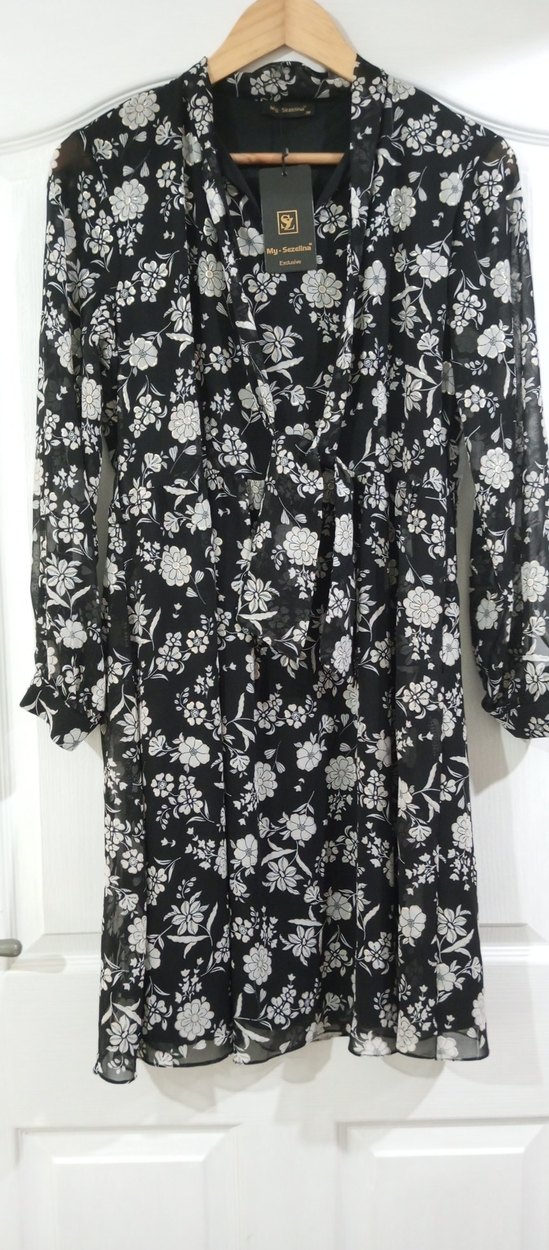ürün şifon kumaş diz altı lçiçek baskılı siyah beyaz ve içine mini sarı renk atmaları var fiyonk bağlamalı V yaka kol uclari düğmeli 38 beden esnek değil iki kol arası 50 cm bel 41 cm boy 92 cm dir son resim de elbisenin üst duruş şeklini resimlemeye çalıştım şık bir elbise günlük kullanıma uygundur