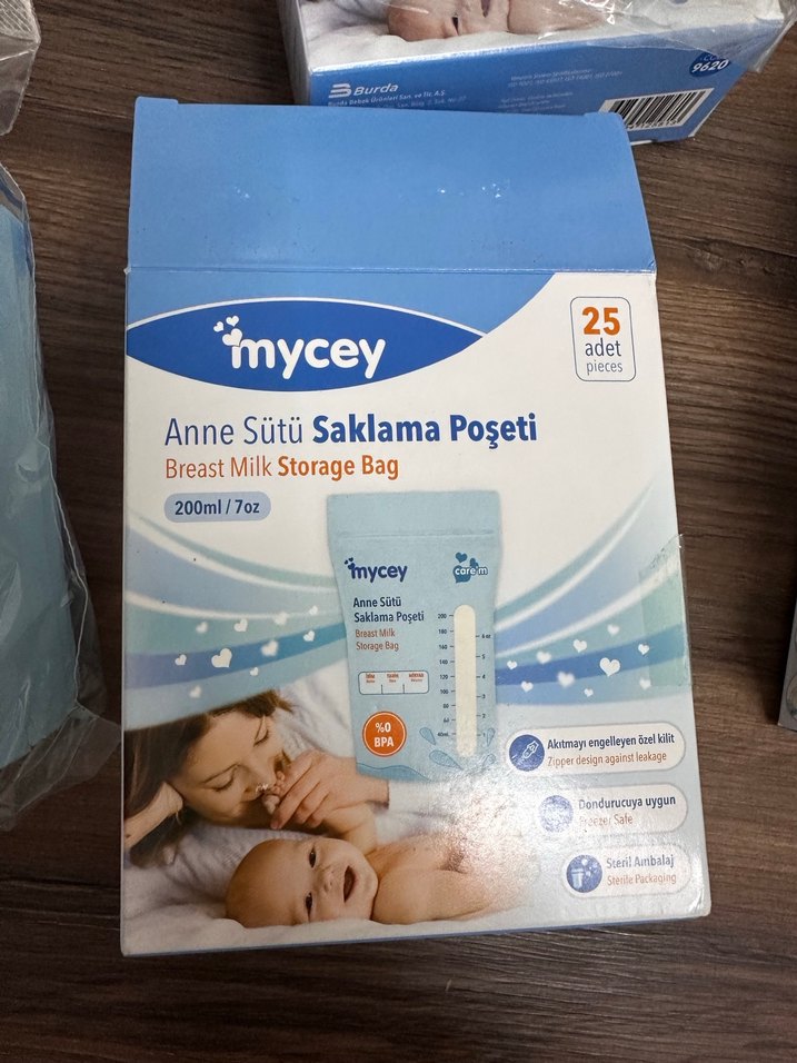 Mycey marka pastel mavi renk 200ml anne sütü saklama poşetleri. Sızdırmaz kilitli, dondurucuya uygun. 25 adet paket içinde. Toplam 6 paket var ihtiyaç olmadığı için kullanılmadı 150 adet yepyeni paketinde süt saklama poşeti