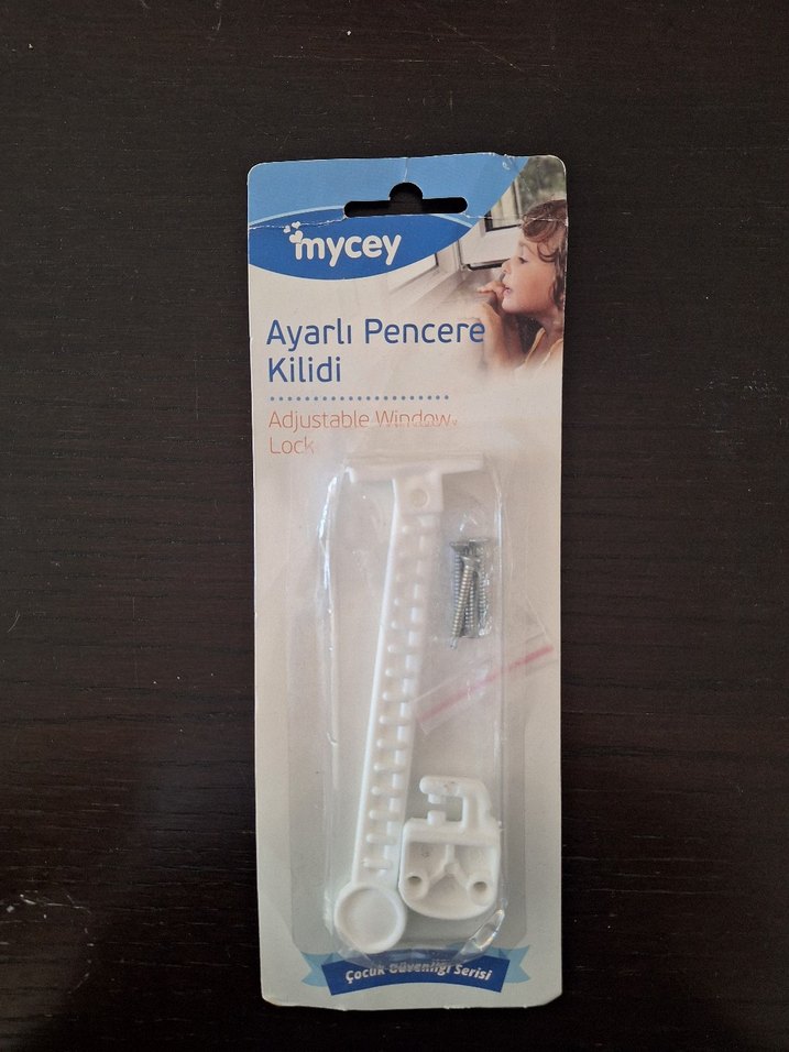 Mycey markalı, vidalarla birlikte beyaz ayarlı pencere kilidi. Çocuk güvenliği için kolay takılır ve pencereleri güvenli hale getirir. #güvenlik #mycey #pencere #kilit