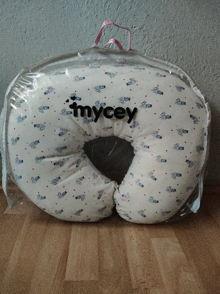 Mycey markalı, beyaz ve gri desenli emzirme ve hamile yastığıdır. Hamilelik ve emzirme sürecinde destek ve konfor sağlar.