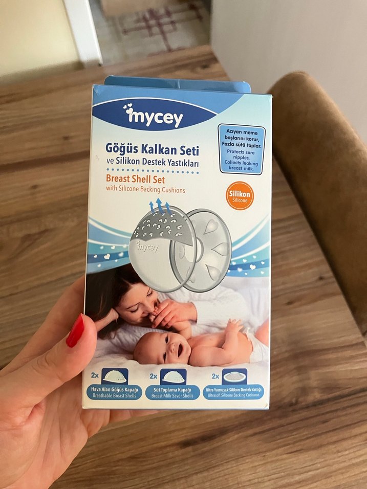 Mycey göğüs kalkan seti, nefes alabilen göğüs kalkanları ve silikon destek yastıkları içerir. Süt sızıntısını toplar ve konfor sağlar.