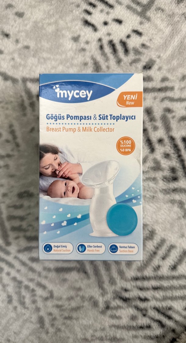 Mycey markalı gri ve mavi renklerde, %100 silikon ve BPA içermeyen göğüs pompası ve süt toplayıcı. Doğal emiş, eller serbest kullanım ve vantuz taban özelliklerine sahiptir. HİÇ KULLANILMADI