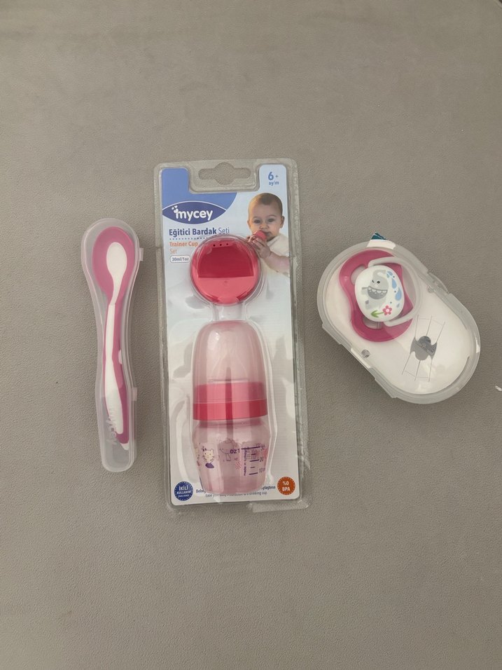 Mycey markalı, 6 ay ve üzeri bebekler için pembe renkli besleme biberonu, kaşık ve emzik tutucu seti. Ve Philips emzik hiç kullanılmadılar sıfır Emzik 175₺ Kaşık biberon 150₺