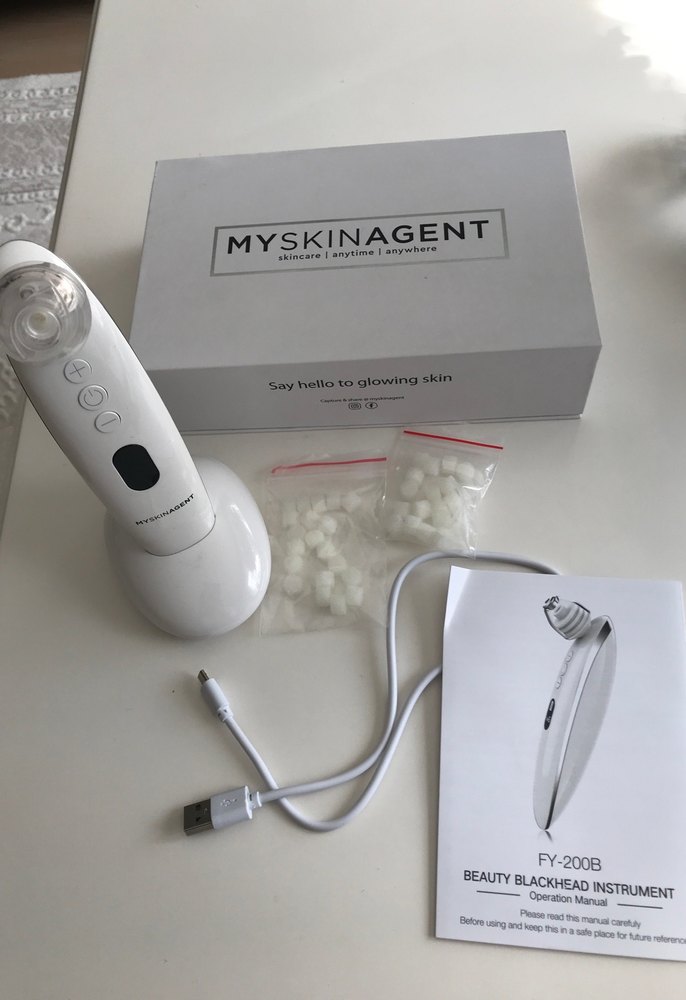 MYSKINAGENT siyah nokta temizleyici, beyaz renkte cilt bakım cihazıdır. Şarj standı, USB kablosu ve yedek uçlarla birlikte gelir. ✨ Yurt dışından hediye gelmiştir hiç kullanılmadı. Ürünlerimde iade yoktur. 4 adet başlığı var. myskınagent #yurtdışıürünü #siyahnoktatemizlemecihazı #ciltbakım