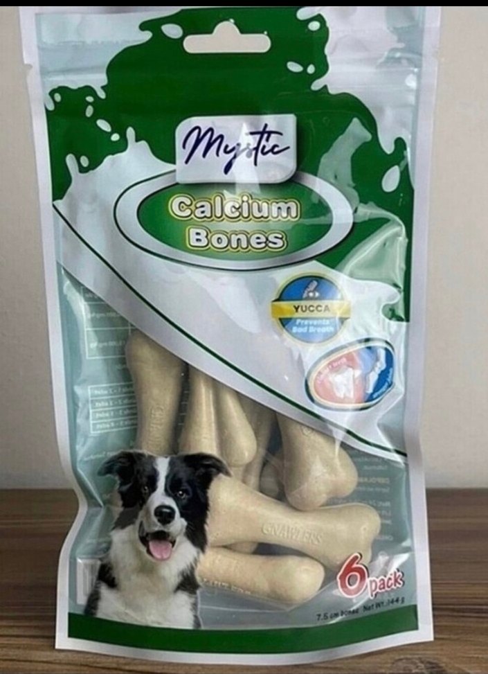 Mystic Calcium Bones köpek ödülleri, sağlıklı kemikler ve sindirim için kalsiyum ve yucca içerir. 6'lı paket halinde sunulur.