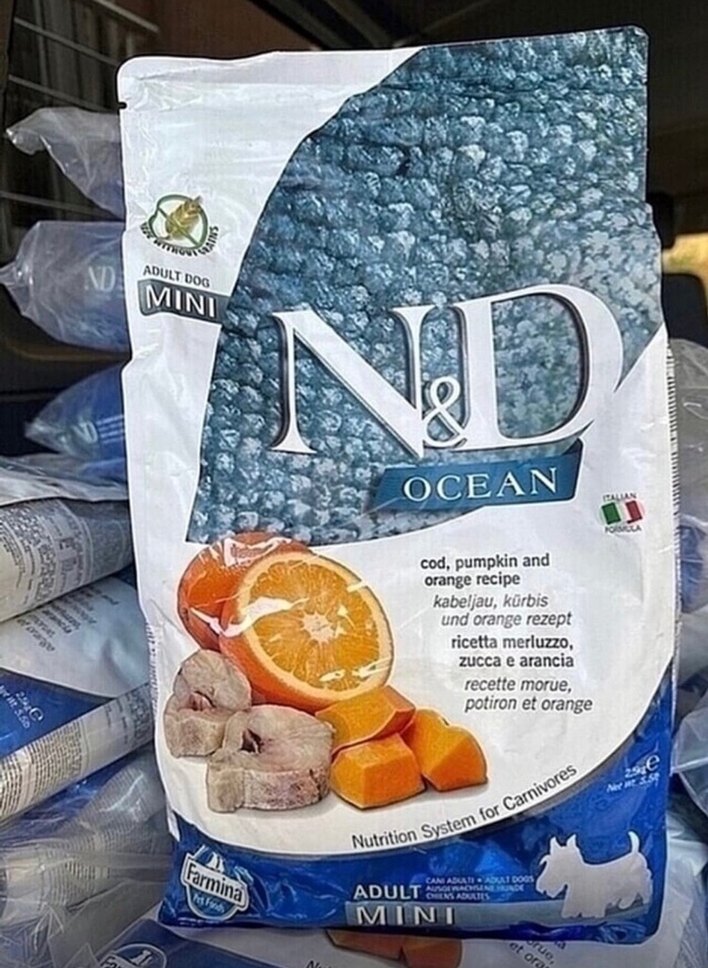 N&D Ocean Mini yetişkin köpek maması, morina balığı, kabak ve portakal tariflidir. Küçük ırklar için doğal içeriklerle beslenme sağlar.