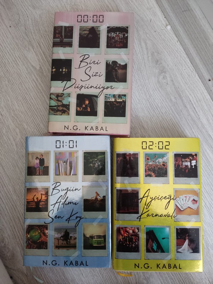 N.G. Kabal'ın "00:00 Biri Sizi Düşünüyor," "01:01 Bugün Adımı Sen Koy" ve "02:02 Ayçiçeği Karnavalı" adlı üç romanı, fotoğraf kolajı kapak tasarımlarıyla birlikte.