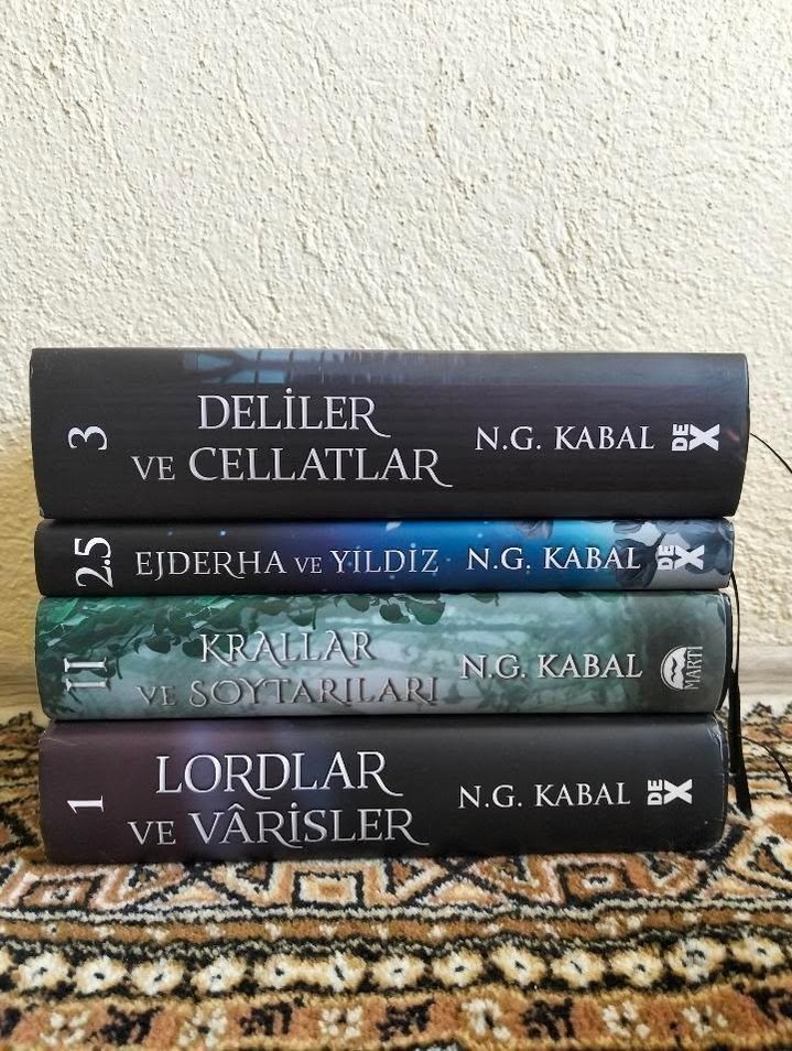 N.G. Kabal'ın Lordlar ve Vârisler, Krallar ve Soytarıları, Ejderha ve Yıldız, Deliler ve Cellatlar kitaplarından oluşan set. kenarlarda çok ufak soyulmalar var kullanıma bağlı ama çok sorun teşkil etmiyor. çizik yırtık yok, temiz okundu