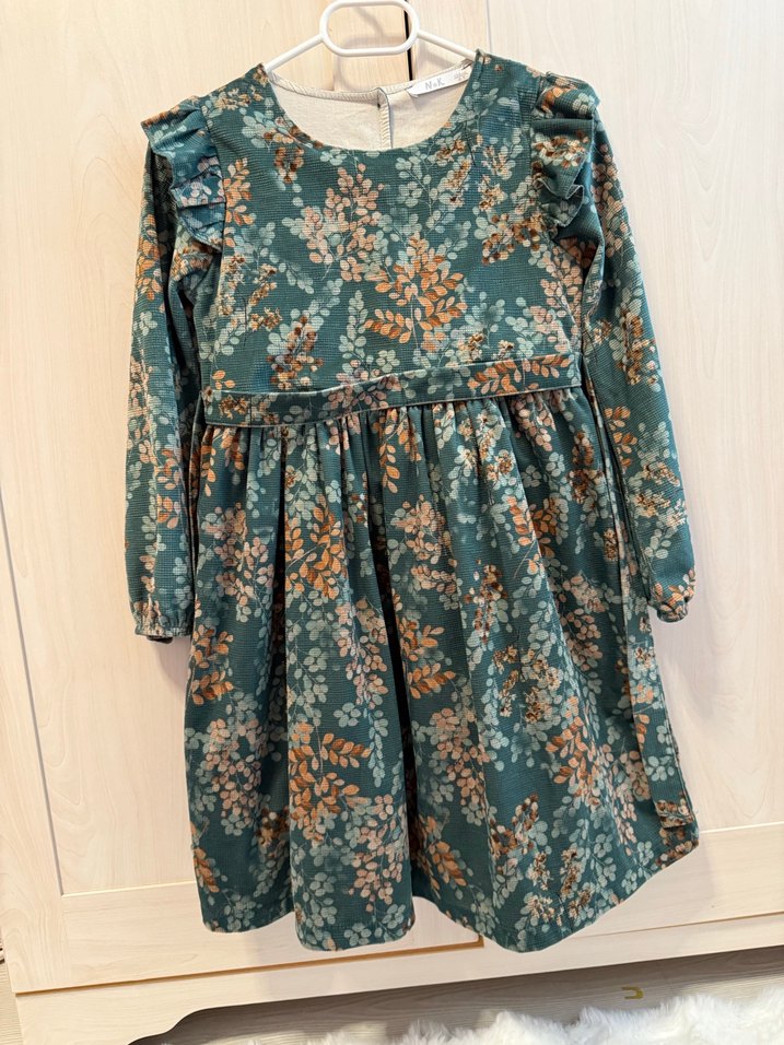 Yeşil renkli, uzun kollu, bol kesim bohem tarzında kız çocuk elbisesi. Omuzlarda fırfır detayı ve çiçek desenleri bulunur.
