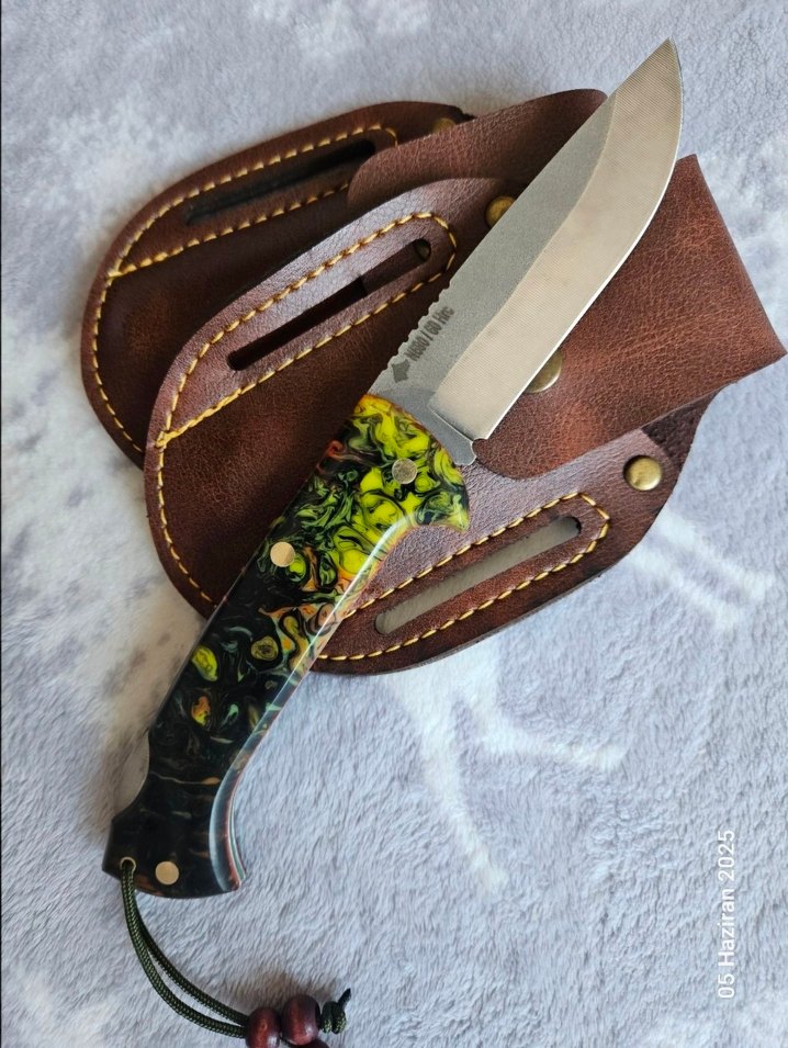 GÖKTÜRK Böhler N690 çelik, epoksi kabze, sırttan kilitli, kemerde taşıma kılıflı, av bıçağı formunda (25cm), ömürlük çakı.