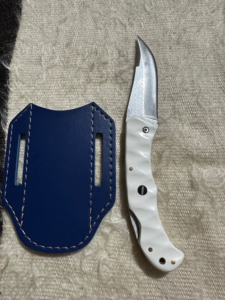 Compack saplı ve kavisli bıçağa sahip katlanır bıçak, mavi deri kılıf ile birlikte geliyor. Çelik N690 sırttan kilitli kaliteli çakı