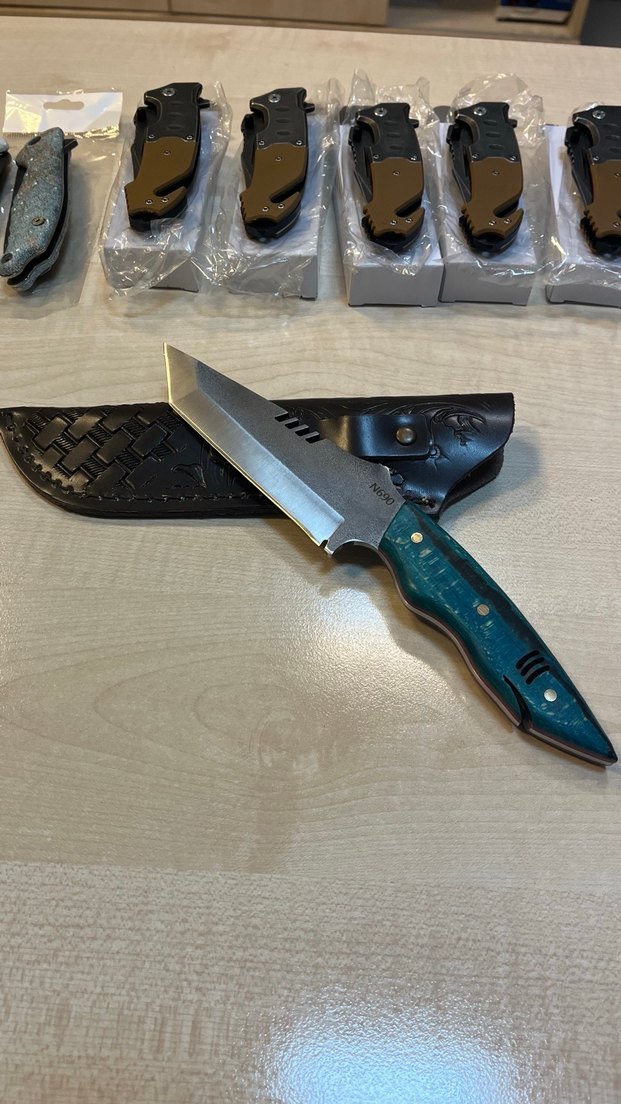 Stabilize kabze N690 çelik vaketa deri kılıflı kamp ve avcı bıçağı köpek balığı model