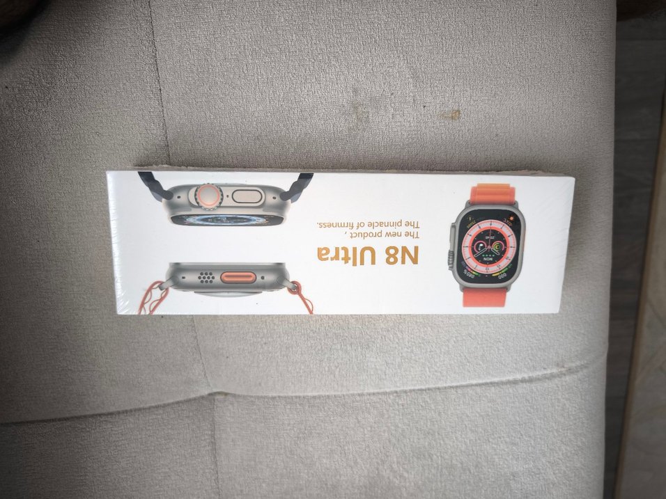 N8 Ultra akıllı saat, gri gövde ve turuncu kayış ile canlı ekran sunar. Fonksiyonel ve şık bir tasarıma sahiptir. ⌚