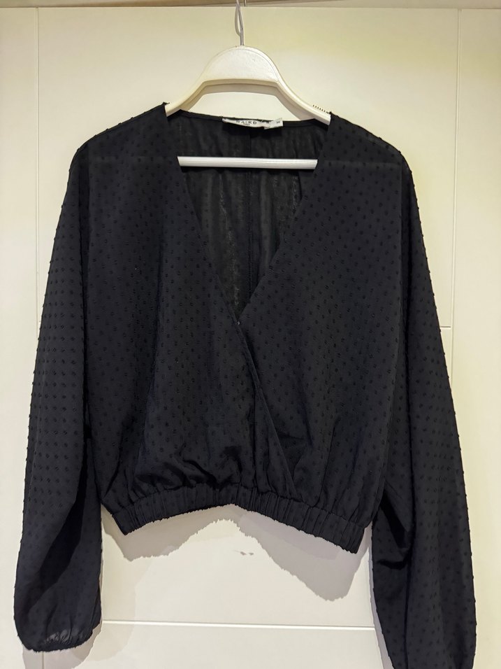 Siyah, V yakalı, uzun kollu, kısa kesim kadın bluz. Rahat kalıp hem gece hem günlük kullanım için uygundur.
