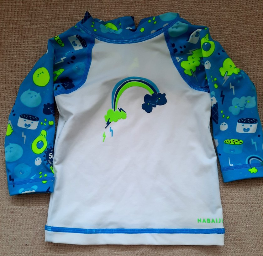 Dekotlon markalı, uzun kollu çocuk mayosu, renkli mavi ve önünde eğlenceli baskılı gökkuşağı deseni bulunur. Yumuşak ve rahat kumaştan üretilmiştir.