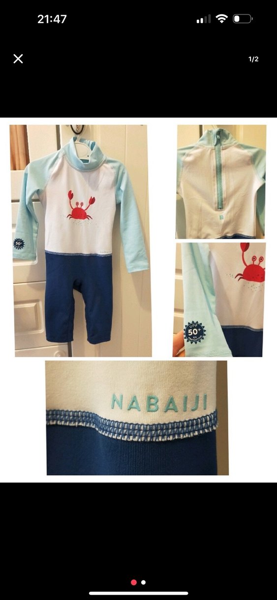 NABAIJI markalı, pastel mavi renkli, uzun kollu ve örme kumaştan yapılmış bebek erkek tulumu. Sırtında fermuar ve baskılı yengeç deseni bulunur. UV korumalıdır.