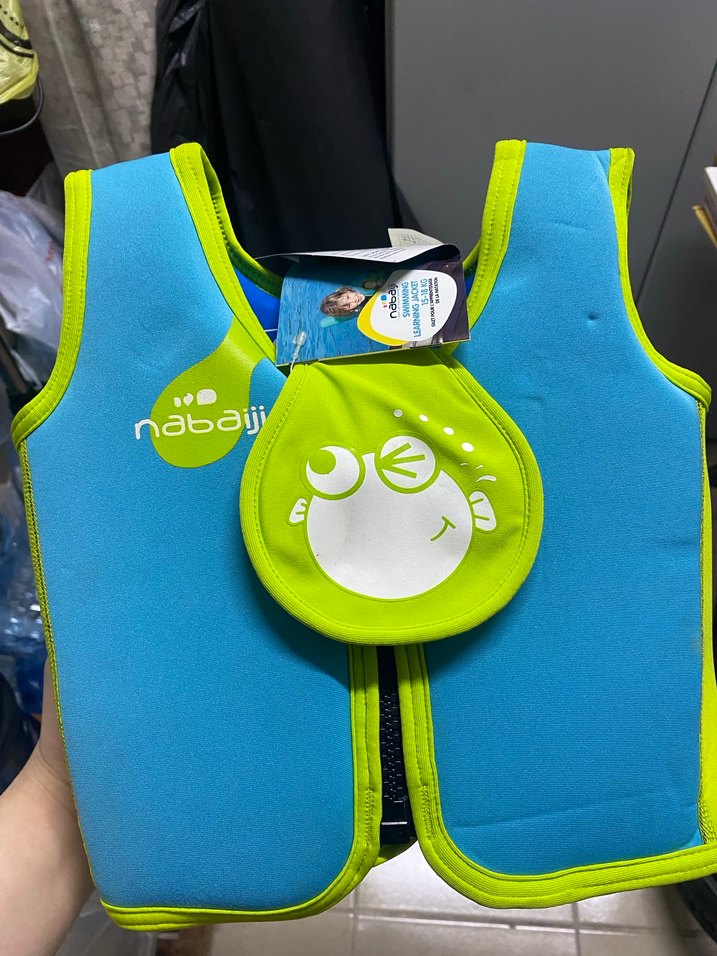 Sıfır etiketli 15-18 KG Nabaiji çocuk can yeleği, mavi ve yeşil renklerde yumuşak malzemeden üretilmiş olup önünde eğlenceli bir balık deseni bulunur.