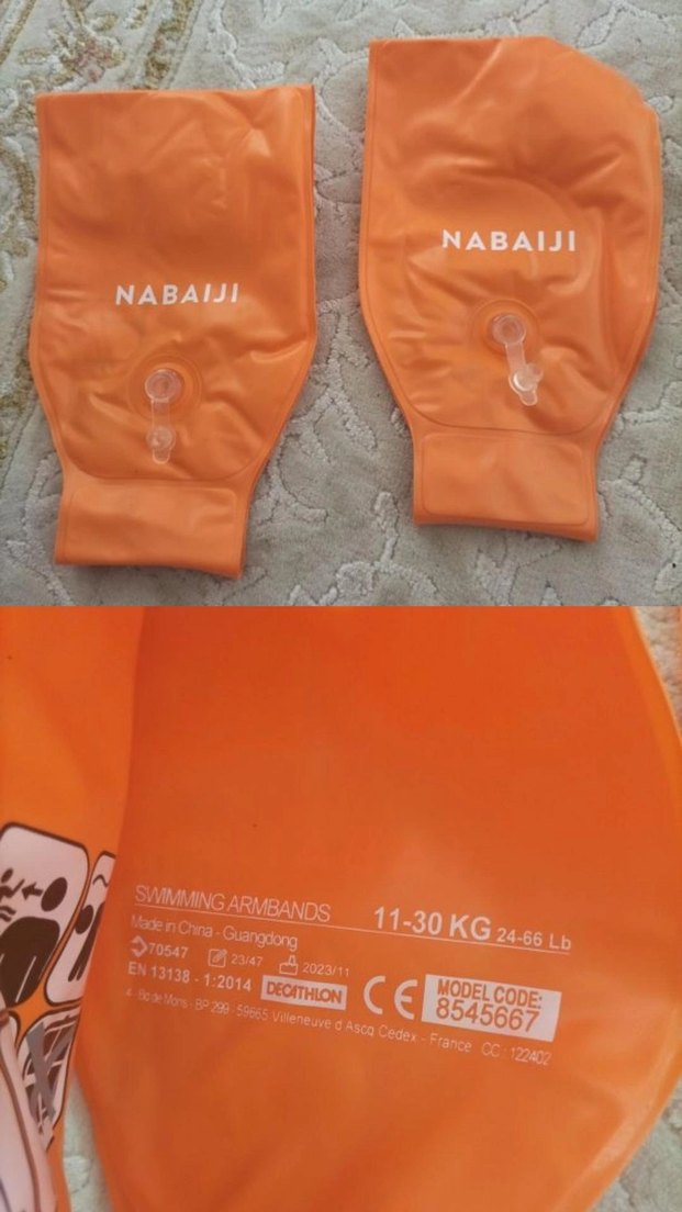 Parlak turuncu plastik biker tarzı çocuk kollukları, cırt cırtlı, marka detaylı baskılı. 11-30 kg için uygundur. Decathlon marka hiç kullanmadım