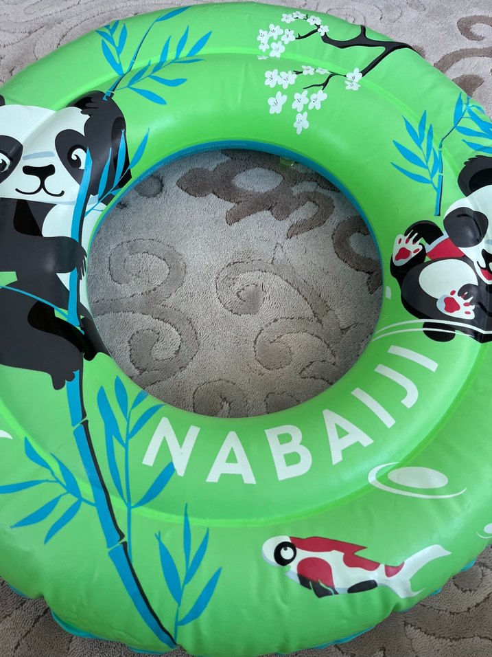 Renkli yeşil çocuk deniz simidi, panda ve balık desenleriyle plaj veya havuz keyfi için uygundur. Sağlam çocuk deni6z simidi