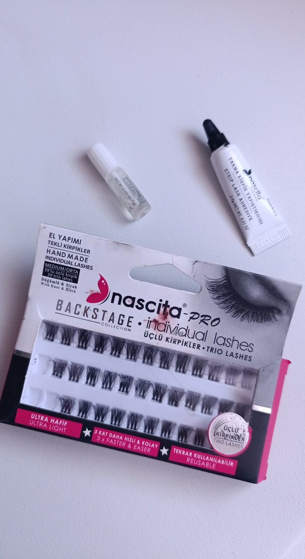 medium 30'lu üçlü kirpik seti sadece 3 bölüm kullanıldı. bir şeffaf yapıştırıcı bir de siyah yapıştırıcı ile beraber satıyorum. mezuniyetim için almıştım sadece bir kere kullandım. Kullanılanların yeri belli diğerlerine dokunulmadı.