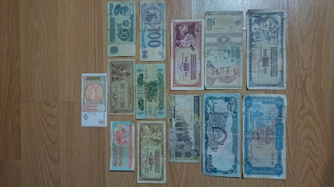 13 adet Farklı ülkelerden (Yugoslavya, Romanya, Rusya, Ukrayna, Afganistan vb.) bir araya getirilmiş, çoğu artık tedavülde olmayan eski kağıt para koleksiyonu. İçerik: Yugoslavya yüksek değerli paralar, Romanya Lei, Ukrayna Karbovantsiv ve çeşitli Orta Doğu banknotları. Durum: Kondisyonları fotoğraflarda görüldüğü gibidir, nostaljik ve tarihi değeri yüksektir.(hepsinin fiyatıdır)