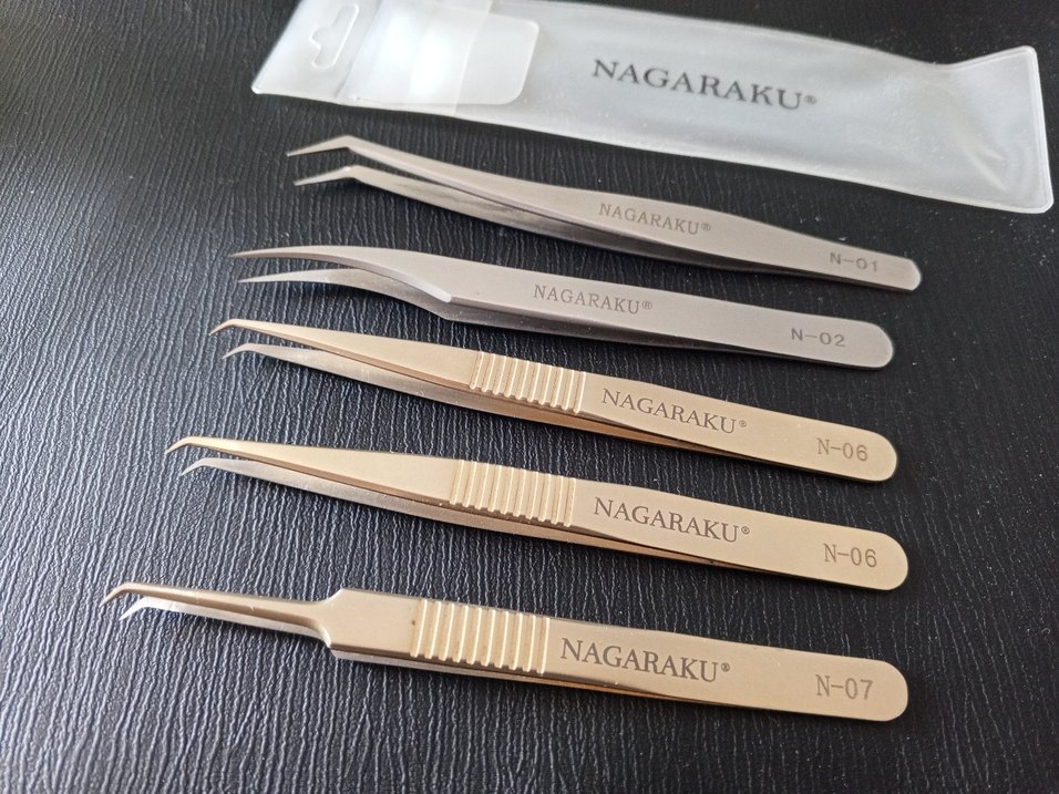 NAGARAKU markalı, farklı uçlara sahip altın renkli manikür cımbız seti. Her parça, tutuşu kolaylaştıran dokulu yüzeye sahip.