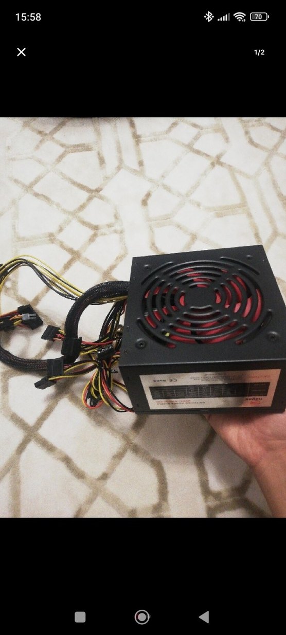 Üst kısmında kırmızı fan bulunan koyu renkli bilgisayar güç kaynağı. Bağlantı için çoklu kablolar mevcuttur. SAĞLAM BİR GÜÇ KAYNAĞI SORUNU YOKTUR ALAN PİŞMAN OLMAZ!!
