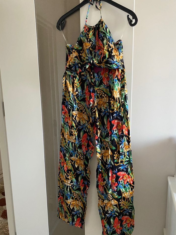 Askılı, straplez yakalı takım. Koyu tonlarda çiçekli batik desenli. Hiç giyilmemiştir. Etiketli.
