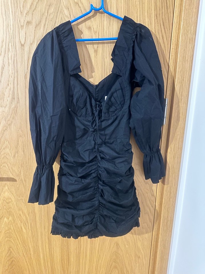 Siyah, uzun kollu, drapeli ve V yakalı fitted mini elbise. Keten kumaştan yapılmış, ön kısmı büzgülü ve şık bir görünüme sahip. Zarif şık ✨