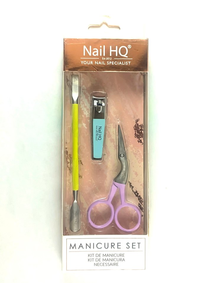 Nail HQ markalı, pastel renklerde tırnak makası, tırnak kesici ve itici içeren çok renkli manikür seti.