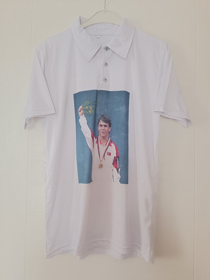 Naim Süleymanoğlu baskılı hem günlük hem sporda kullanılabilecek rahat kaliteli esnek beyaz renkli, kısa kollu, düğmeli ve baskılı ön yüzü olan bol kesim tişörttür.