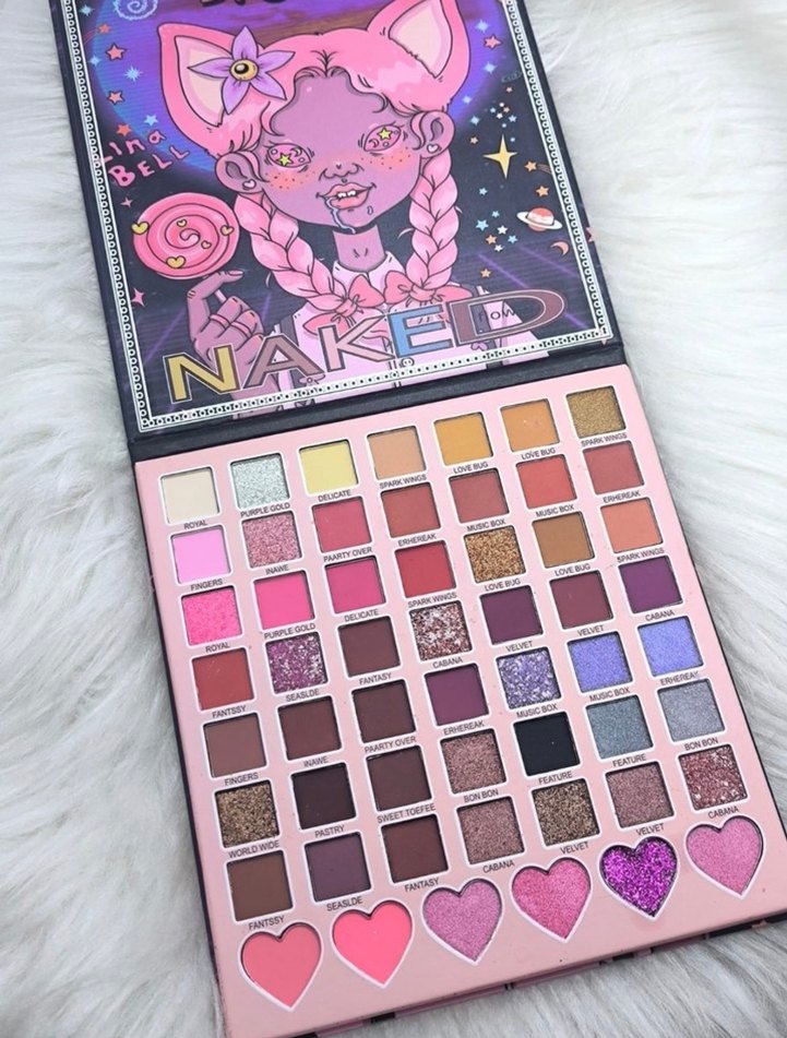 Bu göz farı paleti, pembe, mor, kahverengi ve mavi tonlarında mat ve simli renkler içerir. Kalp şeklinde özel farlar da bulunur.