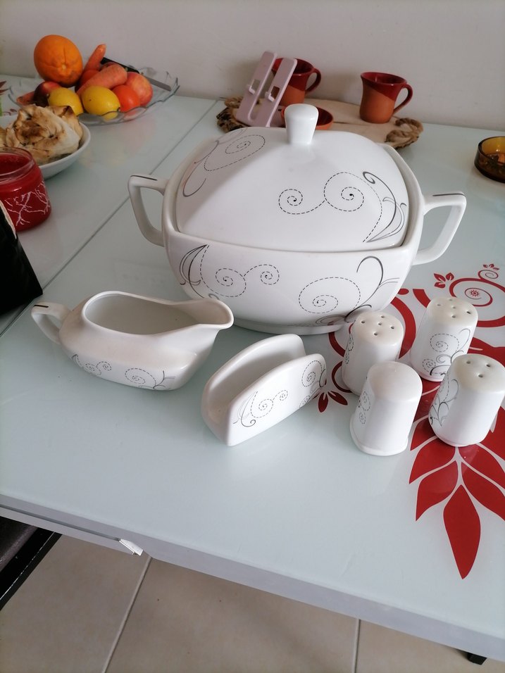 Gri nakış desenli beyaz sofra takımı, kapaklı çorba tenceresi, sosluk, tuzluk-karabiberlik kürdanlık ve peçetelik içerir. ️