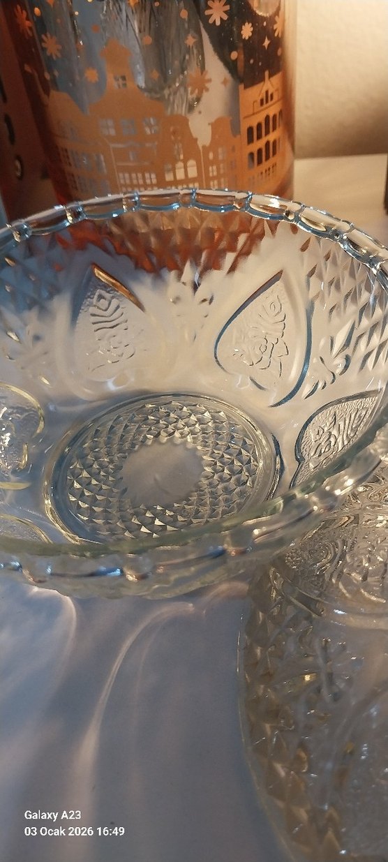 Parlak beyaz cam şekerlik, nakış desenli kalp motifleri ve detaylı kenar işçiliği ile klasik bir görünüm sunar. ️Kristal 1930/50 lere aittir.