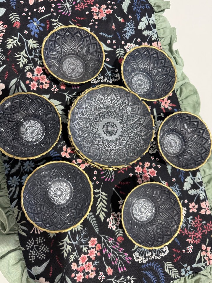 Nakış desenli, altın kenarlı siyah bohem tarzı servis kaseleri seti.