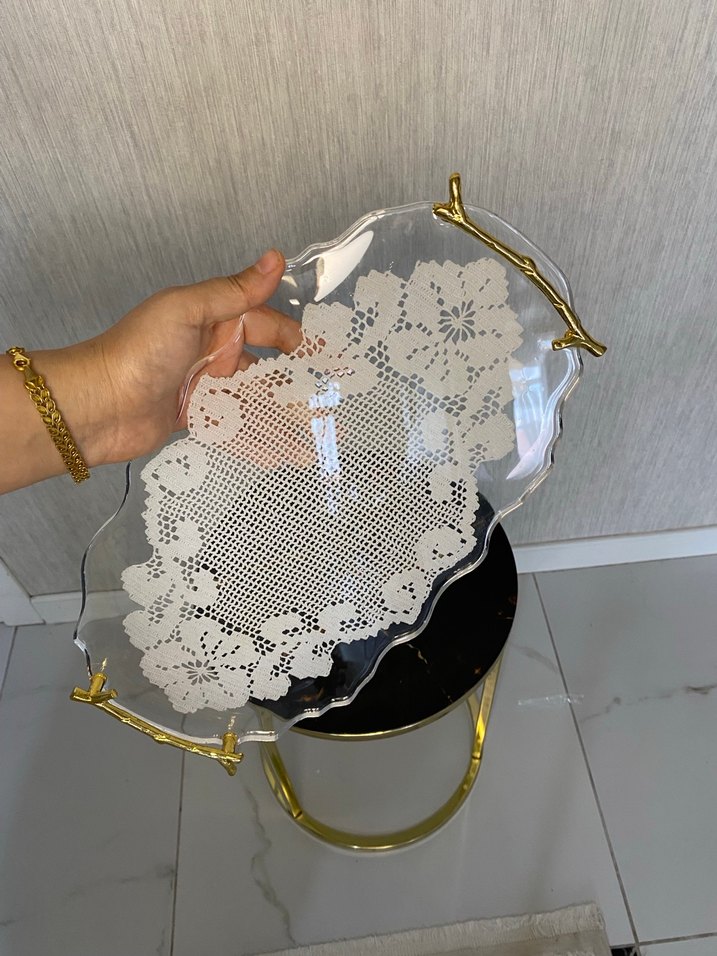 Nakış işlemeli desenlere sahip vintage tarzda beyaz tepsi, altın tonlu kulplarla zarafeti ve kullanışlılığı bir araya getiriyor.