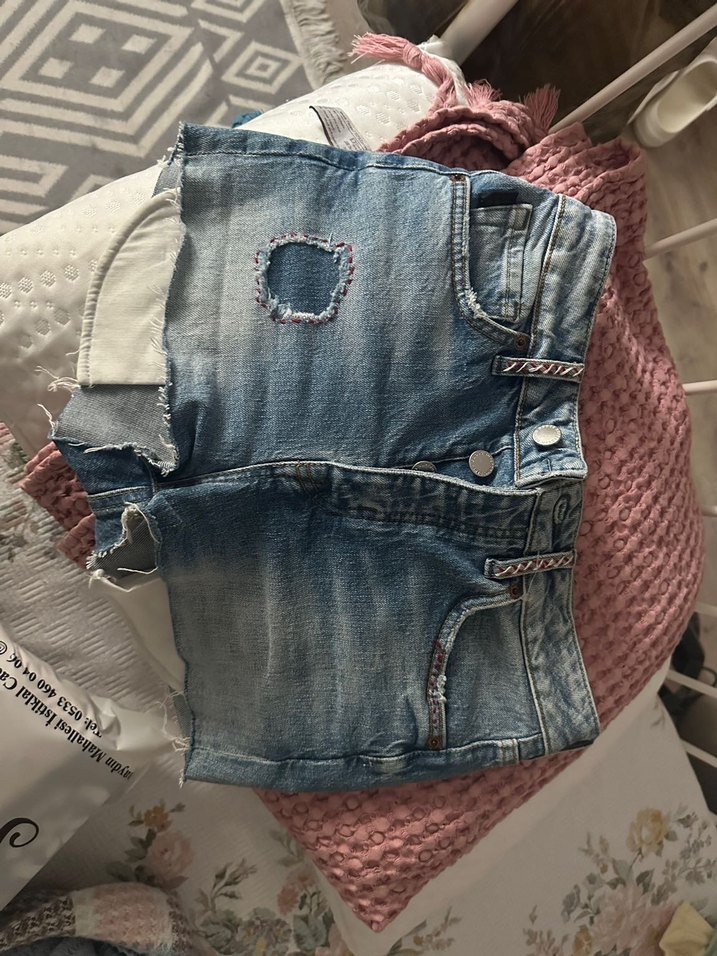Nakış detaylı, açık mavi mini kot şort. Düğmeli, bol kesim ve günlük rahat sokak stili için uygun. Beymen mağazasından aldım ürün hiç kullanılmadı