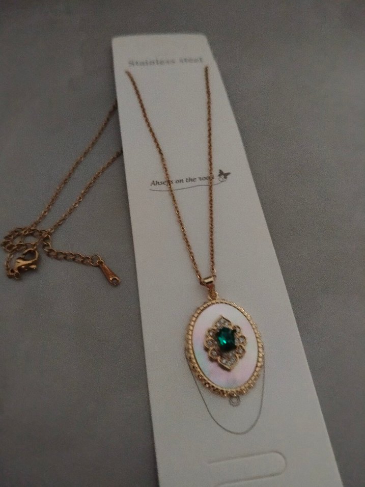 Altın renkli, zincir detaylı, nakışlı işlemeli yeşil taşlı bohem kolye, günlük kullanıma uygun.