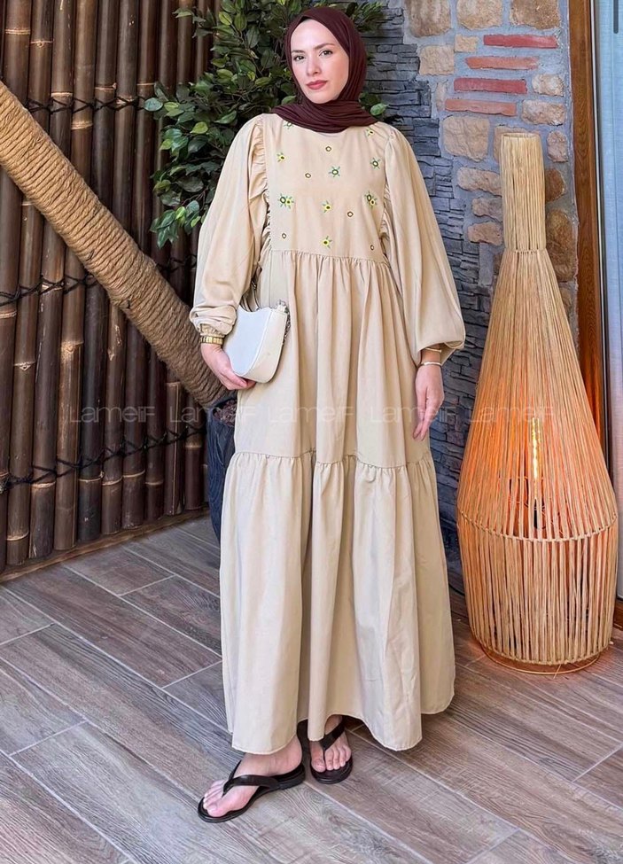 Nakışlı detaylara sahip bej uzun elbise, pamuklu yumuşak kumaştan, bol kesim ve uzun kolludur. Bohem tarzıyla günlük kullanıma uygundur.