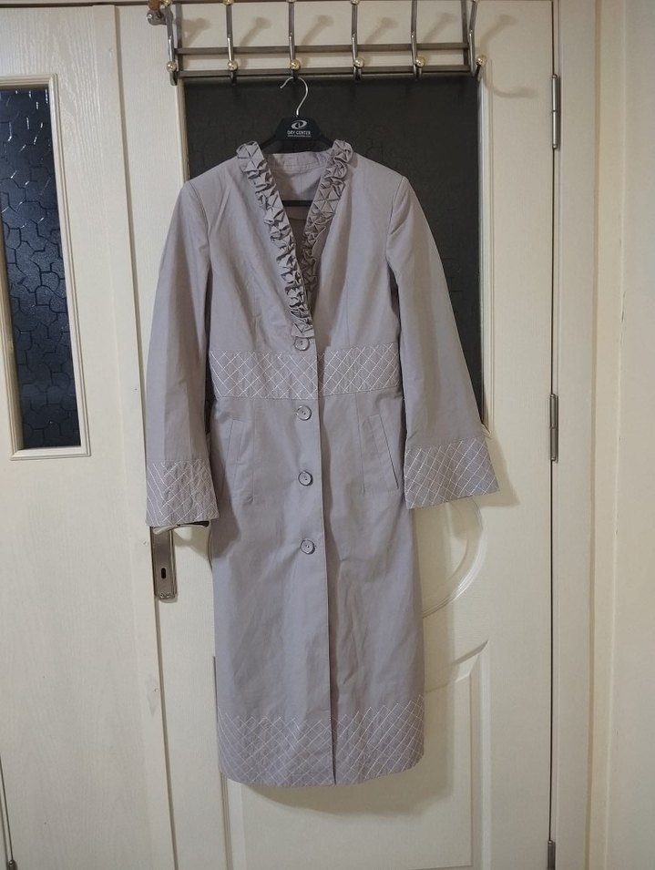Bej renkli, keten kumaş uzun kadın pardesü düğmeli ve yaka detaylıdır. Kol, etek ve bel kısmında nakışlı desenler bulunur. Modern klasik tarzda, ofis için uygundur. hiç bir deforme yok