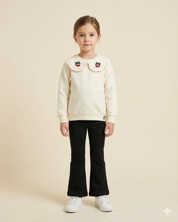 Bej renkli kız sweatshirtü, yuvarlak yaka ve uzun kollu, nakışlı yakasıyla yumuşak ve rahat kumaştan yapılmıştır.
